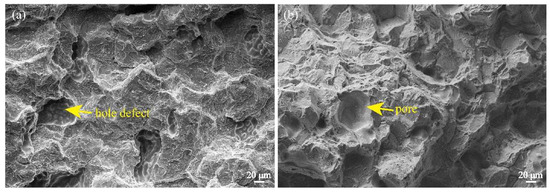 Figure 11 shows the fractographic morphology of as-deposited and T6 heat-treated alloys in the horizontal direction. A large number of cleavage facets and a small number of tear ridges in the fractured surface of the as-deposited alloy can be found, and the fracture mode was mainly brittle fracture (Figure 11a). The existence of pores, hole defects, and secondary crack defects on the fractured surface reduced the strengths and ductility of WAAM alloys. After T6 heat treatment, the tear ridges on the fractured surface almost disappeared, the fracture became flatter, and the sizes of pores became significantly larger (Figure 11b). Some related research demonstrated that micro-pores will aggregate and grow during the high-temperature heat treatment of aluminum alloy, resulting in an increase in the sizes of the pores [21,22]. More severe pores and hole defects lead to a further decline in the ductility of the alloy.