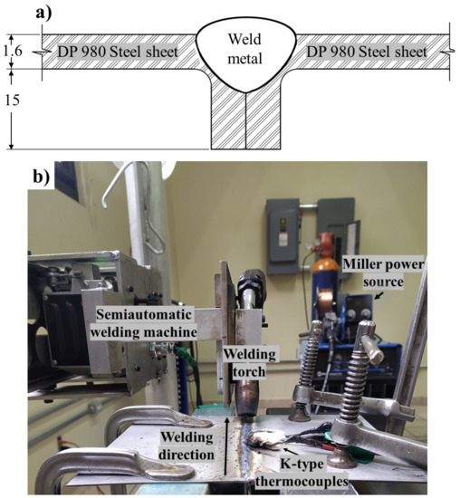 DP980 steel sheets with dimensions of 280 mm × 140 mm × 1.60 mm were joined using a standard flare V-groove configuration in agreement with the standard AWS D9.1 [15], as showed in Figure 1a. Table 1 presents the chemical composition for the DP980 steel sheet and Spoolarc 120 filler metal (The ESAB group Inc., Hanover, PA, USA), respectively. To obtain the joints, the GMAW process was performed using a Miller® Dimension 652 power source (Miller Electric Mfg. LLC., Appleton, WI, USA) equipped with a control panel, wire feeder, and a welding torch. A semiautomatic device implemented by the working group (CIITEC, Mexico City, Mexico) was used to keep a constant welding speed and a straight path. Shielding gas consisting of a mixture of 20% CO2 and 80% Ar (volume fraction) was used at a flow rate of 0.03 m3·min−1. The used welding parameters were a V voltage of 20 V, I current of 90 A, v travel speed of 5 mm·s−1 and a pre-heating temperature of 240 °C. According to Equation (1), a heat input Q of 302 J·mm−1 was determined considering a thermal efficiency η of 84% for the GMAW process [16]. In addition, K-type thermocouples were placed on the welding plate (at distances of 4 mm and 5.5 mm from the weld center) to obtain temperature measurements in the HAZ. Figure 1b shows the experimental setup for the welding process and the K-type thermocouples attached to the plate, which were connected to a data acquisition card from National Instruments model 913. An insulator ceramic was used to protect the thermocouple sensors from the electric arc.