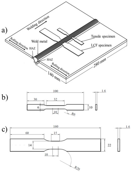 (a) Schematic representation of welded joint and the specimens located. (b) Specimen geometry used for tensile tests and (c) for LCF tests. All dimensions are in mm.