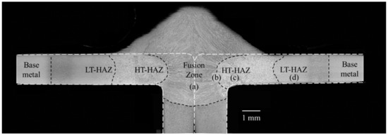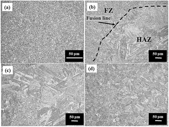 Different microstructures of the welding zones: (a) FZ, (b) transition of the FZ to the HAZ (fusion line can be observed), (c) HT-HAZ and (d) LT-HAZ.