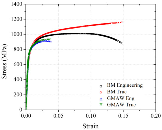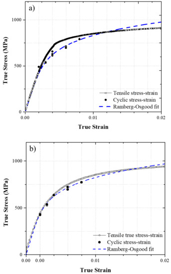 The Ramberg-Osgood model is shown in Equation (4) and was used to fit the true stress-strain data. The fit allowed the determination of the strength coefficient K and strain hardening exponent n. For additional - data, the Hollomon constitutive model (Equation (5)) was used to obtain extrapolated data until the fracture point.