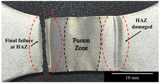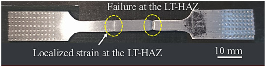 The stress-strain behavior is presented in Figure 8 for the DP980 steel sheet and welded joints, and their mechanical properties are summarized in Table 3. For the DP980, a ductile material behavior was observed, with an engineering fracture strain of around 0.15. The mechanical properties were determined based on this stress-strain behavior according to the mechanical properties specified by the mill test certificate. Regarding the welded joints, the stress-strain behavior proved detrimental to the ductility since it was calculated as a reduction of about 75% with respect to the base metal (DP980 steel sheet); therefore, the toughness also decreased. This diminution can be explained by a larger martensite content in the FZ, HT-HAZ, and the LT-HAZ compared to the DP980 steel sheet. As previously explained, each welding zone contains a characteristic type of martensite with different hardness values. Furthermore, a joint efficiency of 89% was obtained as a ratio of the welded joint strength to the DP980 steel sheet strength [26]. However, the failure took place at the softened region in the LT-HAZ, as shown in Figure 9, due to the presence of tempered martensite, which decreases the strength of the joint. This behavior has been previously reported in the literature [10,13,14].