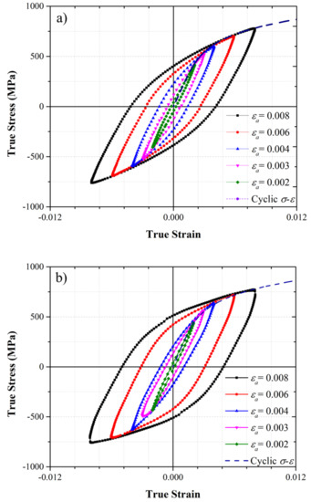 The cyclic stable response in terms of true stress vs. strain for the DP980 steel sheet and welded joint is presented in Figure 10a,b. These hysteresis loops were obtained towards the middle of the LCF life, where the cyclic stress relaxation was overpassed. Comparing Figure 10a,b, the DP980 steel sheet exhibited a slender hysteresis loop for 0.006 and 0.008 strain amplitudes. Thus, the plastic strain was higher for the welded joint subjected to high strain amplitudes under cyclic stable response. In the case of strain amplitudes equal to 0.004 or smaller, both materials presented narrow hysteresis loops, with just a small difference between the DP980 and welded joint. The welded joint exhibited the slender hysteresis loops, which apparently indicated a smaller plastic strain than in the DP980 steel. However, the hysteresis loops correspond to the cyclic stable response of the materials and the welded joint could not present the smaller plastic strains.