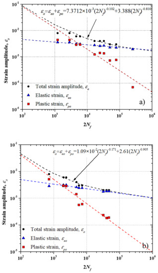 Total strain vs. 2Nf. (a) DP980 steel sheet and (b) welded joints.