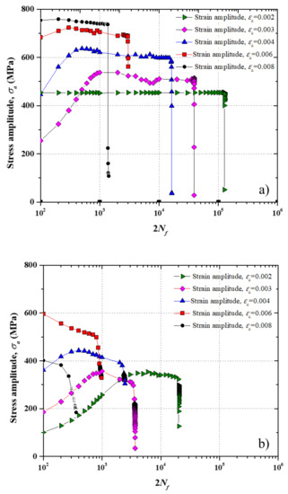 Variable stress amplitude vs. number of cycles at different strain amplitudes for: (a) DP980 steel sheet and (b) welded joints.