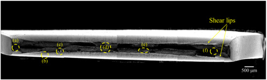 The evaluation of fracture surface was done by a Scanning Electron Microscope JEOL 6300, equipped with SEI (Secondary Electron Image) with an acceleration voltage of 20 keV. This analysis was carried out taking a welded joint sample evaluated in LCF at εa = 0.006. This examination corresponds to the macroscopic and microscopic characteristics. The areas observed are marked with letters. In the macroscopic analysis of this fracture surface (Figure 16), in the LT-HAZ (where failure took place), plastic strain is evident at the edges where a thickness reduction is present. On the other hand, shear lips can be observed as a result of crack growth in the plane stress condition [31], attributed to the small thickness of the fatigue sample. Regarding the microscopic examination, the fracture exhibited ductile characteristics as observed in Figure 17a, where microvoids nucleation and coalescence was observed, which correspond with the final stage of fracture during the LCF test, and tear ridges are also shown as overload evidence due to the small remaining area when the crack length is critical. Deformation bands were observed at the edge of the tested fatigue sample, as shown in Figure 17b. A mixed fracture mode was present in some areas, where cleavage, quasi-cleavage, and microvoids coalescence were present. This was the main fracture mechanism found for most of the fracture surface, which was associated with a higher martensite content in this area and the presence of a ductile phase as ferrite (Figure 17c–e). Mainly cleavage was found in the area near the edge of the sample (Figure 17f). This characteristic can be found near the crack initiation point [31]. Furthermore, due to the tempered martensite content at this zone, cleavage is one of the mechanisms exhibited due to its brittle phase, and cleavage is a low energy fracture, as reported by Pandey et al. [32].
