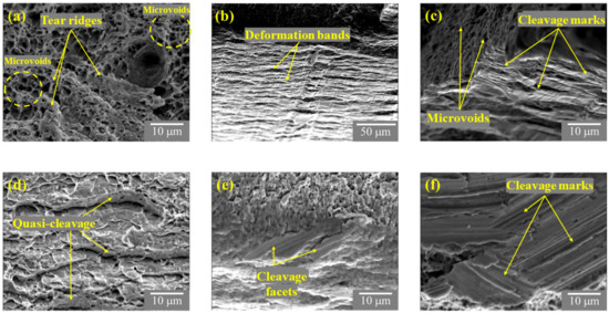 Details of different fracture features along the failed sample. (a) shows microvoids, (b) exhibits deformation bands at the outer face of a shear lip, (c) mixture of ductile and brittle zones at the inner wall of a shear lip, (d) quasi-cleavage, (e,f) evidence cleavage.