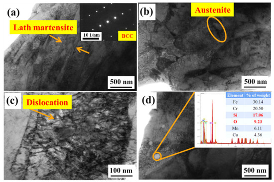 The TEM morphological images of the 17-4PH high-strength steel samples formed by SLM are shown in Figure 2. As the TEM sample becomes thinner, perforations tend to form in the fine grain at the boundary of the molten pool. Examining the TEM images, the samples’ structure mainly included lath martensite with the body-centered cubic (BCC) crystal structure and austenite grain with the face-centered cubic (FCC) crystal structure. As shown in Figure 2a, the width of the lath martensite was 200–300 nm. As shown in Figure 2b, the trace width of residual austenite along the boundary of the martensite lath was 200–300 nm. The crystal structure of the martensite was BCC, and a high density of dislocations was observed as shown in Figure 2c. Moreover, as shown in Figure 2d, many spherical inclusions (with particle sizes in the 50–170 nm range) were also present in the TEM images. According to the EDS composition analysis of the precipitates, the contents of the O and Si elements were high, and these spherical inclusions were determined to be Si-rich oxides.