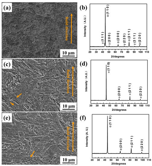 SEM images of the morphology of 17-4PH high-strength steel: (a) SLM-processed; (c) heat-treated in solution at 940 °C; (e) heat-treated in solution at 990 °C. XRD patterns of 17-4PH high-strength steel: (b) SLM-processed; (d) heat-treated in solution at 940 °C; (f) heat-treated in solution at 990 °C.