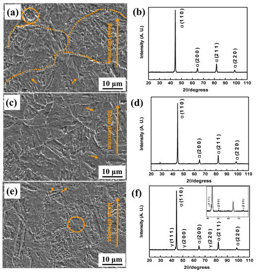 SEM images of the morphology of 17-4PH high-strength steel: (a) heat-treated in solution at 1040 °C; (c) heat-treated in solution at 1090 °C; (e) heat-treated in solution at 1140 °C. XRD patterns of 17-4PH high-strength steel: (b) heat-treated in solution at 1040 °C; (d) heat-treated in solution at 1090 °C; (f) heat-treated in solution at 1140 °C.