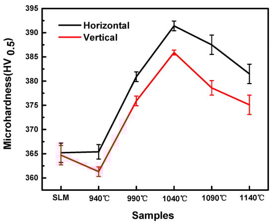 Figure 5 shows the hardness values of the studied 17-4PH high-strength steel samples that were obtained using the SLM-based method and different solution treatment methods. The hardness improved owing to the heat treatment (the horizontal build direction was the X-Y section, and the vertical build direction was the X-Z section). When the solution temperature was increased to 1040 °C, the X-Y section hardness of the alloy samples peaked at approximately 392 HV0.5, while the X-Z section hardness peaked at approximately 381 HV0.5. Following that, the hardness of the alloy samples decreased as the solution temperature increased. The increase in the samples’ hardness was due to the strengthening effect caused by the complete martensite structure and small precipitates in the samples. The hardness values for the X-Y sections and the X-Z sections of the untreated samples that were made using the SLM-based method were the same. After the heat treatment, the hardness values of the X-Y and X-Z sections were different; the hardness of the X-Z section was lower than that of the X-Y section. For the solution temperature of 940 °C, the hardness was in the 360 HV0.5–365 HV0.5 range, similar to that of the non-heat-treated samples that were made using the SLM-based method. For the solution temperature of 1140 °C, the hardness of the X-Y section samples decreased to 383 HV0.5 and that of the X-Z section decreased to 375 HV0.5. This was because, at a solution temperature that was too high, the stability of the austenite increased and the transformation temperature Ms of the martensite decreased, resulting in an uneven martensite structure, a higher amount of retained austenite, higher ferrite content, and lower hardness. After the solution treatment, the microstructure became hard-phase martensite. The dispersed precipitation hardening phase that precipitates on the martensite lath during aging was shown to improve the matrix hardness [22]. Additionally, many dislocations were observed in the structure, which also affected the samples’ hardness.