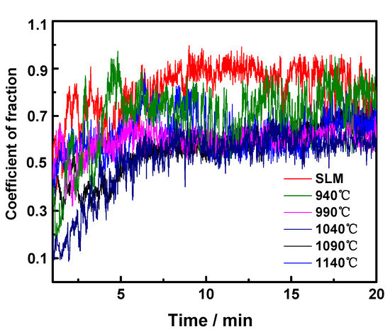 The friction coefficient of SLM-formed samples and samples heat-treated at different solution temperatures.