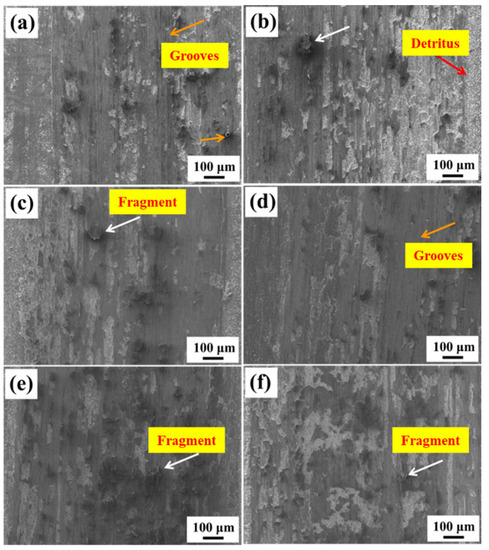SEM images of the morphology of the wear surface of 17-4PH high-strength steel formed by SLM. (a) SLM-formed sample; (b) sample heated-treated in solution at 940 °C; (c) sample heated-treated in solution at 990 °C; (d) sample heated-treated in solution at 1040 °C; (e) sample heated-treated in solution at 1090 °C; (f) sample heated-treated in solution at 1140 °C.