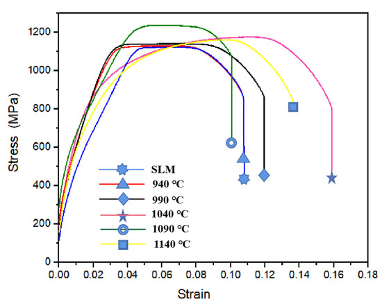 Figure 8 shows the stress–strain curves of 17-4PH high-strength steel formed by SLM and samples heat-treated at different solution temperatures in the 940–1140 °C range. On the whole, the tensile strength of the specimens after heat treatment is improved in different degrees compared with that before heat treatment. Particularly, when the solution temperature is 1040 °C, the trade-off between tensile strength and ductility is better displayed (the tensile strength is 1180 MPa, the strain is 0.16). Compared with Li et al. ’s the tensile properties after the homogenizing heat treatment [23], the tensile properties at the solution temperature of 1040 °C are mainly characterized by the fact that the tensile strength is improved to a certain extent compared with that before the heat treatment without sacrificing its toughness. Similarly, compared with Huber et al.’s modified heat treatments (involving prolonged solution annealing and deep-cooling) [24], the trade-off between tensile strength and ductility under the 1040 °C solution heat treatment in this study was also improved.