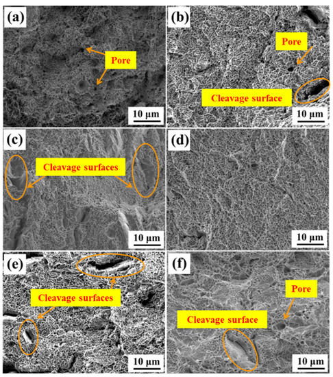 SEM images of the morphology of the tensile fracture of 17-4PH high-strength steel formed by SLM. (a) SLM-formed sample; (b) sample heat-treated in solution at 940 °C; (c) sample heat-treated in solution at 990 °C; (d) sample heat-treated in solution at 1040 °C; (e) sample heat-treated in solution at 1090 °C; (f) sample heat-treated in solution at 1140 °C.