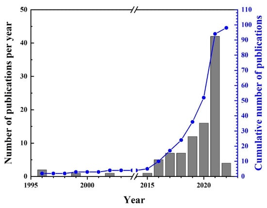 Number of publications relating to the metal MEX from 1996 to February 2022. Data from [4,5,8,9,29,30,31,32,33,34,35,36,37,38,39,40,41,42,43,44,45,46,47,48,49,50,51,52,53,54,55,56,57,58,59,60,61,62,63,64,65,66,67,68,69,70,71,72,73,74,75,76,77,78,79,80,81,82,83,84,85,86,87,88,89,90,91,92,93,94,95,96,97,98,99,100,101,102,103,104,105,106,107,108,109,110,111,112,113,114,115,116,117,118,119,120,121,122,123].