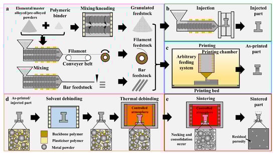 Comparison of material extrusion additive manufacturing of metal (a,c,d,e) and metal injection moulding (a,b,d,e).