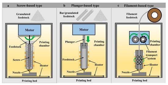 Types of material extrusion additive manufacturing classified by feeding system: (a) screw-based, (b) plunger-based and (c) filament-based types.