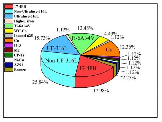 As metal MEX is developed based on the principle of MIM, the range of available materials for metal MEX is rather similar to MIM. The materials that are usually fabricated by the MIM process are the sinterable materials, e.g., stainless steel, copper, titanium and its alloys and nickel-base superalloys [149]. Similarly, the main materials utilised in the metal MEX process are stainless steel and titanium alloys, as presented in Figure 7. The utilisation of the materials that have been fabricated by metal MEX can be ranked from the highest to lowest as 316L stainless steel (41.57%), 17-4PH stainless steel (or AISI 630, 17.98%), Ti-6Al-4V (13.48%), Cu (12.36%), WC-Co (4.49%), bronze (2.25%) and high-C iron, H13 tool steel, M2 high speed steel, AZ91 magnesium alloys, CP-Ti, Ni-Cu and Inconel 625 (1.12% each), respectively. For 316L stainless steel, more than one-third of the studies used the commercial 316L filament feedstock from BASF SE, namely as Ultrafuse 316L (UF-316L). It is noted that at the time of writing, the 17-4PH stainless steel filament by BASF [150] has just been launched and there is still no available study. The availability of commercial and high-quality metal filament that can be printed using a general polymer FDM printer, debound and sintered using available MIM equipment, can accelerate the acceptant and utilisation of metal MEX. Interestingly, although the AZ91 Mg alloy (recognized as a material that is difficult to sinter) can be fabricated by metal MEX [87], its mechanical properties still need to be improved by solving the problem of magnesium oxide formation, which prevents proper sintering.