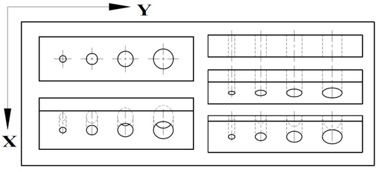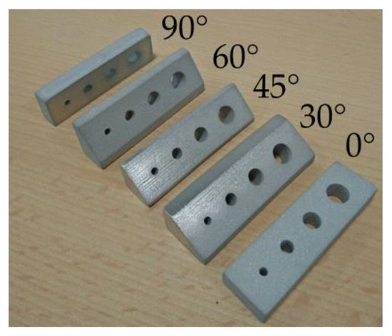 Each sample presents four through holes, whose diameter’s nominal dimensions are 3 mm, 5 mm, 7 mm, and 9 mm, respectively. Other dimensions differ per sample to provide a constant hole depth, as explained in Reference [21].