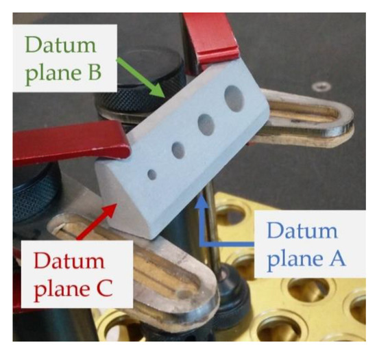 A specific measurement procedure was programmed for each sample in the Hexagon Pc-Dmis 2019R2 suite (Hexagon, Stockholm, Sweden). The routine initially performed a 3-2-1 alignment of sample Datum Reference Frame with respect to the machine reference frame. The primary (A), secondary (B) and tertiary (C) datum planes are indicated in Figure 4. A detailed description of the measurement procedure is given in Reference [21]. After alignment, from 50 to 150 points were acquired on each surface and used to reconstruct the planes by a gaussian best-fit least-squares method. The flatness form error was also calculated, for use as an indicator of the quality of the 3D printing process.