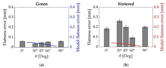 The flatness form error of plane D is shown in Figure 6 for the samples in the green (6a) and sintered state (6b), respectively. The estimated flatness error induced by the staircase error was calculated by Equations (1) and (2), and is reported with the empirical data. Concerning the printing parameters, the layer thickness (Δz) is assumed to be equal to 50 μm, the nominal building angle (θg) is derived from CAD geometry and the dimensional changes in X and Z directions (εx and εz) are assumed to be equal to −15.5% and −17.8%, respectively, corresponding to the average dimensional change in the linear dimensions, as reported in Reference [21].