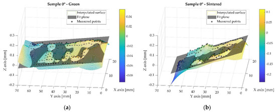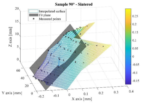 Figure 7 shows the reconstructed surface of plane D for sample 0° at the green (Figure 7a) and sintered (Figure 7b) states, respectively; the asterisk symbols represent the points measured by CMM, the semi-transparent grey surface corresponds to the plane derived by the gaussian best-fit least-squares method of such points. The colored surface represents a surface obtained by the natural neighbor interpolation method of the measured points. The color bar shows the coordinates of the interpolated surface along the Z direction. It should be noted that the interval identified by the color bar does not correspond to the measured flatness form error. The colored surface was obtained by extrapolating the measured points up to the nominal area of plane D, not strictly corresponding to the overall area obtained by the measured points. The clamping system did not allow for the probe to access the plane edges; therefore, the colored surface in such regions was unconstrained by the measured points and the shape curvature determined a fake overestimation of flatness form error. This is not considered here; the only scope of reconstruction provides a visual representation of the irregularities in the different samples by looking at the measured area.