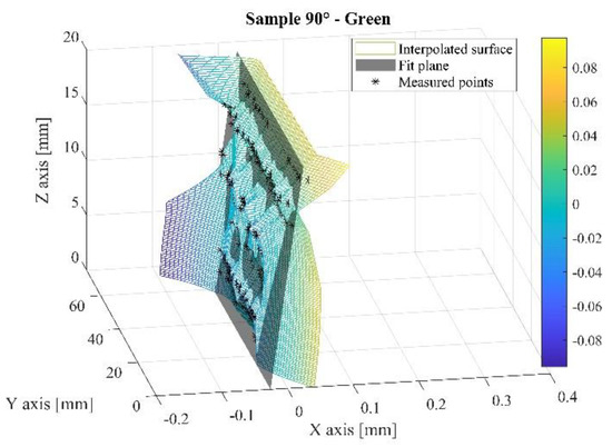 Figure 8 reports the reconstructed surface of plane D of sample 90° at the green state. The figure shows the measured points, the best-fit plane and the interpolated surface, as in Figure 7.