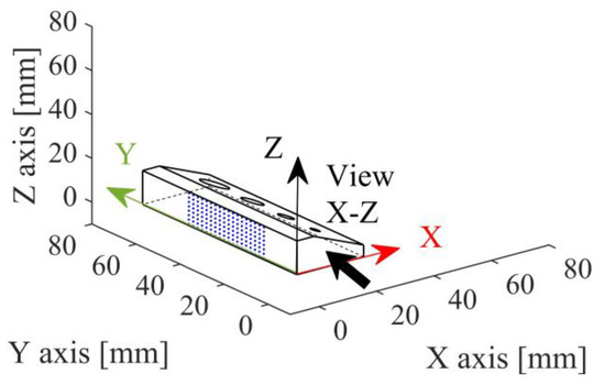 A slight drift in the measured points towards the X direction can also be observed in Figure 8, which could be directly related to a layer shift. To prove this, the position of the points measured on datum plane B was analyzed as follows. Figure 9 provides the axonometric view of sample 30°, showing the datum reference system XYZ and the pattern of points acquired on the datum plane B (parallel to plane Y-Z). These points were projected in Figure 10 on a plane parallel to X-Z plane, as indicated by the arrow “X-Z view” in Figure 9. In addition to the points of sample 30°, Figure 10 reports the points acquired on the datum plane B in the other geometries, according to the datum reference system of each sample.