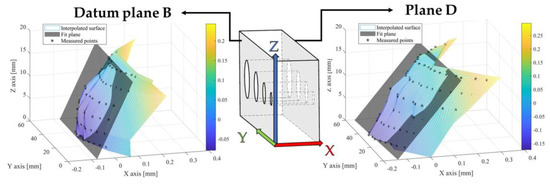 Figure 12 clearly shows that flatness form error can be directly ascribed to the shape deformation of the sintered sample. The concave shape of plane D is also confirmed in the opposite plane, datum plane B, which shows the same deformation, as displayed in Figure 13 referred to sample 90°.