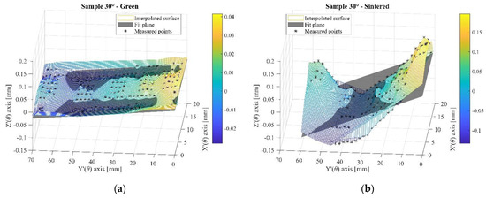 Figure 14. Sample 30° (a) points measured at the green state and reconstruction of the plane; (b) points measured at the sintered state and reconstruction of the plane.
