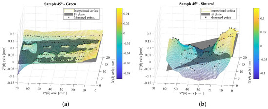 Figure 15. Sample 45° (a) points measured at the green state and reconstruction of the plane; (b) points measured at the sintered state and reconstruction of the plane.