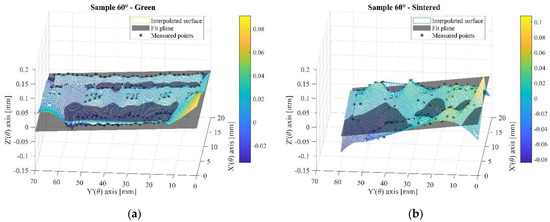 Figure 16. Sample 60° (a) points measured at the green state and reconstruction of the plane; (b) points measured at the sintered state and reconstruction of the plane.