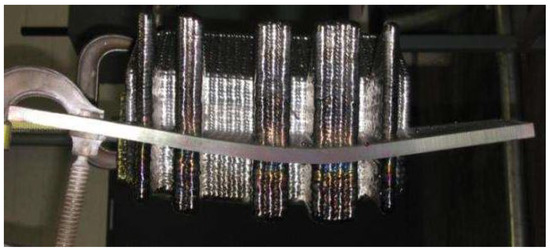 Distortion of NP1 fabricated using EBAM technology on a 1.27 cm plate; part geometry measures 40 cm in width and 18 cm in height. Thermal cycling and the weight of the printed material have permanently deflected the base plate as shown.
