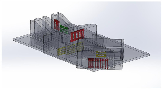 3D representation of the as-printed part with the tensile test specimen locations isolated. Red are vertically oriented specimens in the z-direction, yellow are horizontally oriented across the body in an x-y plane, and green are purely horizontal specimens either in x or y-directions. The part geometry measures 40 cm in width, 72 cm in length, and 18 cm in height.