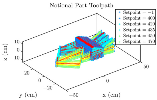 Since there was no thermal monitoring during the processing of NP1-3, the variable became the most critical for the development of the model. The measurement was provided by automated graphical analysis of video images taken in real-time during the deposition. Images were analyzed by an in-house software to determine the melted pool width just behind (trailing by about 2.54 cm) the actively depositing nozzle. However, due to geometry and variations in image contrast, optical measurements used to record the variable were at times limited. In the event of turning a corner, for example, optical tracking of the bead would be unable to track the deposited bead and measurements would become erroneous. The setpoint value, another recorded variable, reported the intended beadwidth at specific build locations. Setpoint values are a function of the deposition geometry measured in pixels, where 100 pixels = 2.54 mm. When the setpoint is equal to −1, the printer is not actively printing and processing parameters are not being recorded. When the setpoint is equal to a value other than −1 the build control algorithm is operative and the deposition data are considered in the linear regression analysis.