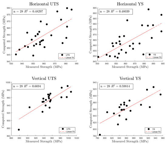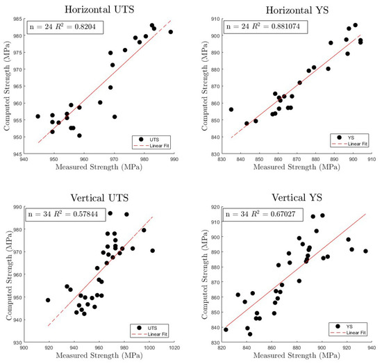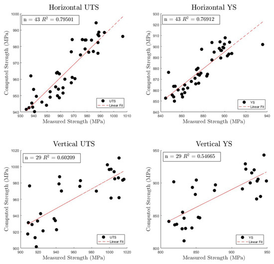 Figure 6 shows the measured strength when compared to the computed strength and for the horizontally and vertically oriented test specimens, respectively, with a line of linear best fit plotted to show the idealized test case. Table 7 and Table 8 show the calculated coefficients and n and values for NP2 using the chosen Z-axis volume variation of 0.1. Equations (12) through (15) show the final linear regression model equations. As seen, the model’s predictive ability is better for specimens that are oriented in the horizontal direction with an value of 0.8204 for the , and 0.88107 for the . The vertical orientation has an value of 0.57844 and has a value of 0.67027. The significant variation in values might be explained by the cooling rates varying significantly in the vertical direction. The representation of the cooling rate needs to be more thoroughly investigated or fully recorded during the deposition process. However, there is a marked improvement in the prediction when compared with the results obtained for NP1 primarily due to the improved processing variable capture in NP2. By better controlling the printing process, the formation of the beadwidth and speed were more consistent throughout the printing process leading to a more consistent value for .
