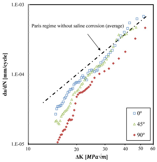 3.3. Fatigue Crack Growth under Saline Corrosion