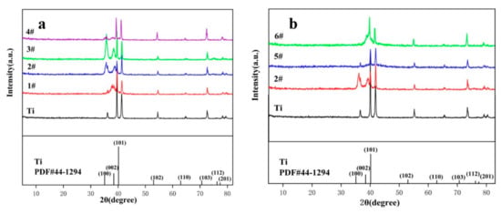 The XRD patterns of various Cu/Ti composite coatings are shown in Figure 1. The position of the titanium peak (100) of samples 2# and 3# is shifted from Figure 1a, and the diffraction peaks of Ti are broadened more obviously. The broadening of the diffraction peaks may be because Cu is solid dissolved in Ti crystals to form a solid solution of Ti, causing lattice distortion, peak broadening and peak shifting.