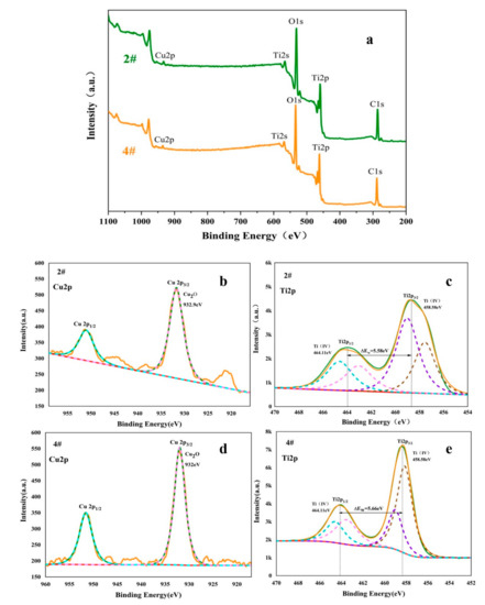 XPS spectra of 2# and 4# samples: (a) full spectrum, (b) 2# Cu2p, (c) 2# Ti2p, (d) 4# Cu2p, (e) 4# tip.