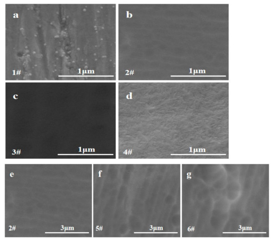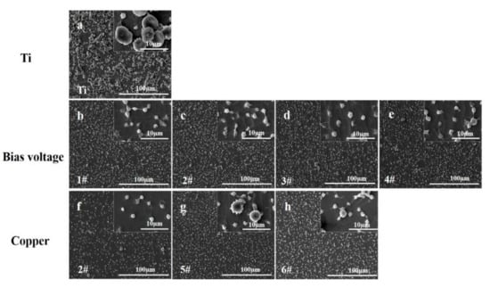 The SEM morphology of the Cu/Ti composite coatings is shown in Figure 3. It can be clearly observed that the surface of the Cu/Ti composite coating is uniform, and grain boundaries and obvious cracks are not found. All coatings show directional streaks, which may be caused by grinding of the substrate. The surface smoothness of the Cu/Ti coating first increases and then decreases following the increase in the bias voltage. A suitable energy is conducive to the migration of sputtered atoms under a suitable deposition bias; thereby, the surface smoothness would be increased. Some particles were observed on the surface of the 4# coating and distinct crystal boundaries between the particles were also found. These results might be due to the introduction of bias, leading to the enhancement of the energy deposition effect, which was conducive to the growth of surface grains. It can be seen from Figure 3e–g that the density of sample 2# is higher than that of samples 5# and 6#: this is because the sputtering energy of copper is relatively low, so the Cu content of sample 6# is higher than that of sample 2# and sample 5#.