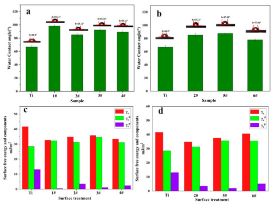 The contact angle and surface energy of various samples: (a) the contact angle of 1#–4#, (b) the contact angle of 2#, 5# and 6#, (c) free energy of 1#–4#, (d) free energy of 2#, 5# and 6#.