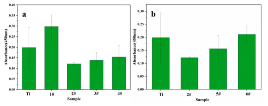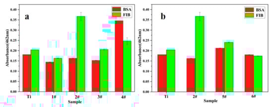 The Protein Quantification Kit (BCA Assay) method was used to further study the adsorption of proteins. The adsorption of albumin can reduce the adhesion and activation of platelets; thereby, the coagulation performance of the material’s surface would be inhibited [28]. On the contrary, the blood compatibility of the material would be reduced owing to the adsorption and denaturation of fibrinogen (FIB) [29]. The adsorption of Bulked Segregant Analysis (BSA) and FIB on the Cu/Ti composite coating is shown in Figure 7. It can be seen from Figure 7a that the amount of BSA adsorbed on the surface of sample 4# is the largest, and the amount of FIB adsorbed on the surface of sample 2# is the largest. It can be found that the adsorption amount of BSA on the surfaces of samples 2#, 5# and 6# increases with the increase in copper content, as shown in Figure 7b.