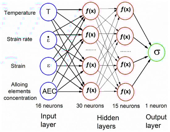 The ANN provides a way to predict functional dependences without preliminary known laws. Such a method shows a minimum calculation error; however, it requires a big set of experimental data. Liu et al. have shown a high accuracy ANN-based model for the determination of the 42CrMo steel hot flow behaviour compared to the Arrhenius-type model [15]. Similar results were obtained by other scholars for API 5CT-L80 [16], AISI-1045 [17], 9Cr-1Mo [18], 10Cr [19], 40Mn [20] and 33Cr23Ni8Mn3N [21] steels. K. Arun Babu et al. have constructed a dynamic recrystallisation model in super austenitic stainless steel [22] using an ANN-based approach. However, all the authors have used ANN-based modelling for the steels with a specific composition and have not used the ability of the ANN to find the dependences of the hot deformation behaviour on the alloying elements concentration.