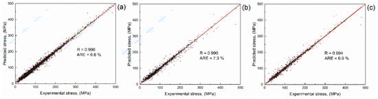 A comparison between predicted using ANN-based model and experimental stress values for (a) training, (b) cross-validation and (c) testing datasets.