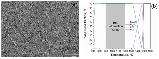 Additional hot deformation tests were carried out to check the accuracy of the constructed ANN-based model. Figure 4a shows an initial microstructure of the investigated steel. The microstructure consists of lath martensite with an average grain size of 10 ± 2.6 μm. Accordingly thermodynamic calculations, the microstructure of the investigated steel at elevated temperatures may contain austenite (fcc), ferrite (bcc), carbide (M23C6) and liquid phases (Figure 4b). In the current investigation, the deformation of the steel was carried out in the austenitic region.