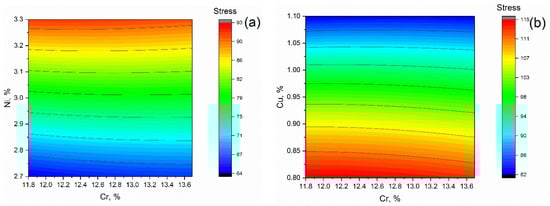 Dependence of the 12Cr3NiCu steel true stress at steady state (a strain of 1) on Cr and Ni (a), Cr and Cu (b) and Ni and Cu (c) concentrations at a strain rate of 1 s−1 and a temperature of 1130 °C.