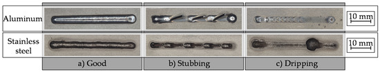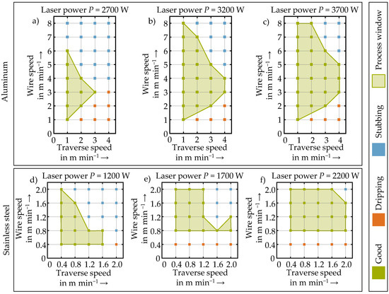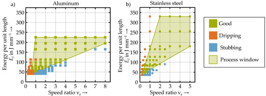 - A suitable combination between the speed ratio and the energy per unit length plays a crucial role in establishing a defect-free process. Therefore, these parameters offer a material-independent valid alternative to the more widely used parameters of the laser power, wire speed, and traverse speed for process development. For both materials, the minimal amount of energy per unit length for a defect-free process was 50 J mm−1. Due to the lower melting temperature of aluminum, a defect-free process could only be achieved using speed ratios above 1, while lower speed ratios resulted in a defect-free process with stainless steel.