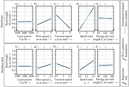 - The correlation between process parameters and the bead width and height for both investigated materials can be approximated by linear models.