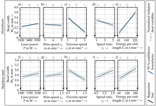 - The bead width increases with a higher laser power and energy per unit length, decreases with higher traverse speeds, and is marginally affected by the wire speed. A higher speed ratio leads to narrower beads for aluminum and wider beads for stainless steel.
